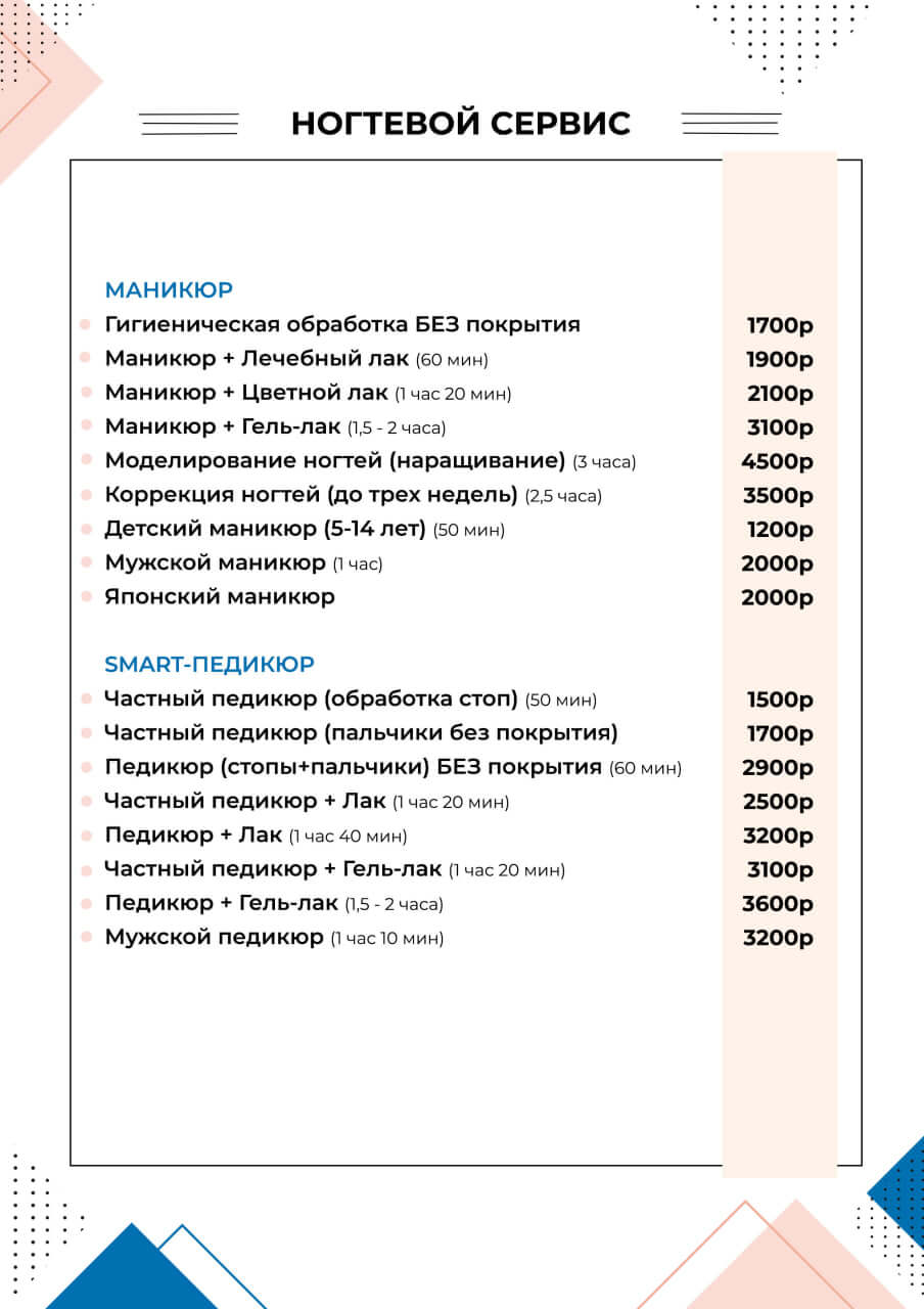 В её арсенале любой вид маникюра, запатентованный Smart-диск для педикюра, покрытие лак/гель-лак, а так же косметическая коррекция ногтей!